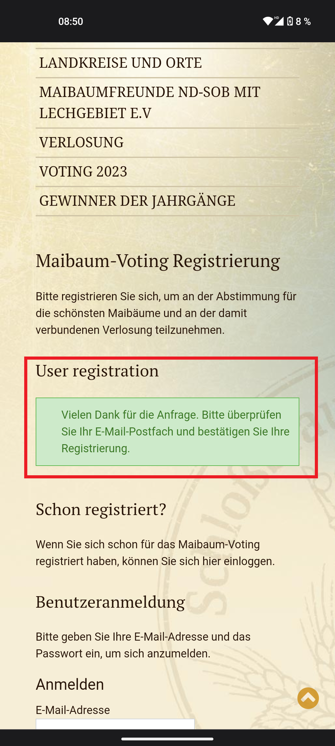 Wenn folgende Meldung kommt, hast du alles richtig gemacht und für unseren Maibaum abgestimmt.