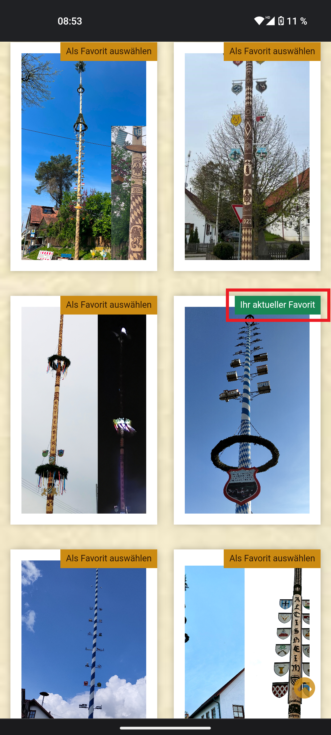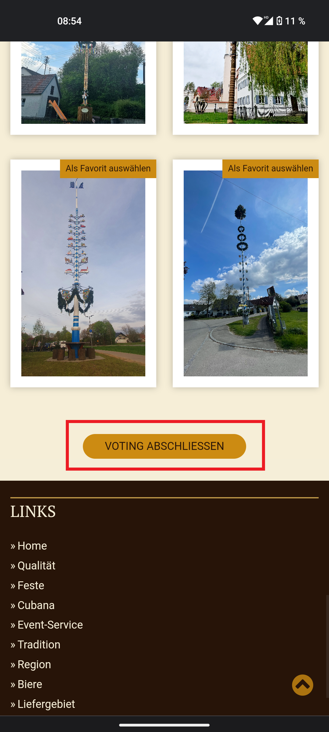 Als Letztes muss die Auswahl des Baums noch abgeschlossen werden! Dazu ganz unten am Ende der Liste der Maibäume auf „Voting abschließen“ klicken.